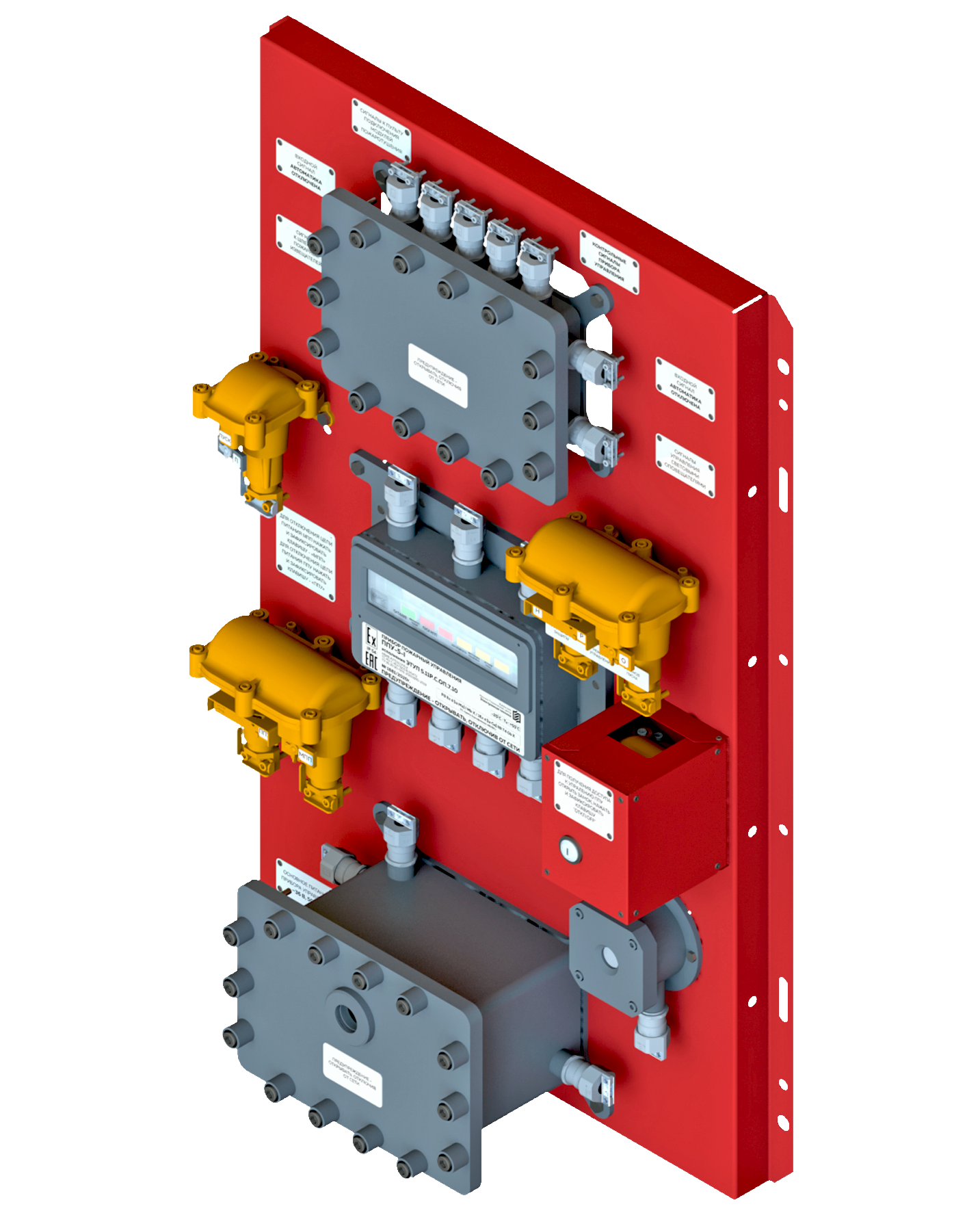 - коробку клеммную распределительную ККР для подключения четырех шлейфов извещателей, входных и выходных сигналов управления, входных и выходных сигналов автоматического управления средствами пожаротушения, сигналов к пульту подключения МПП, сигналов контрольных (КОНТРОЛЬ НАГРЕВА, КОНТРОЛЬ ПОЖАРА, КОНТРОЛЬ АВАРИИ) и сигналов дополнительного управления световым оповещением, выполненной в оболочке ОВР-П.11-М20.12-Б-В1,5;